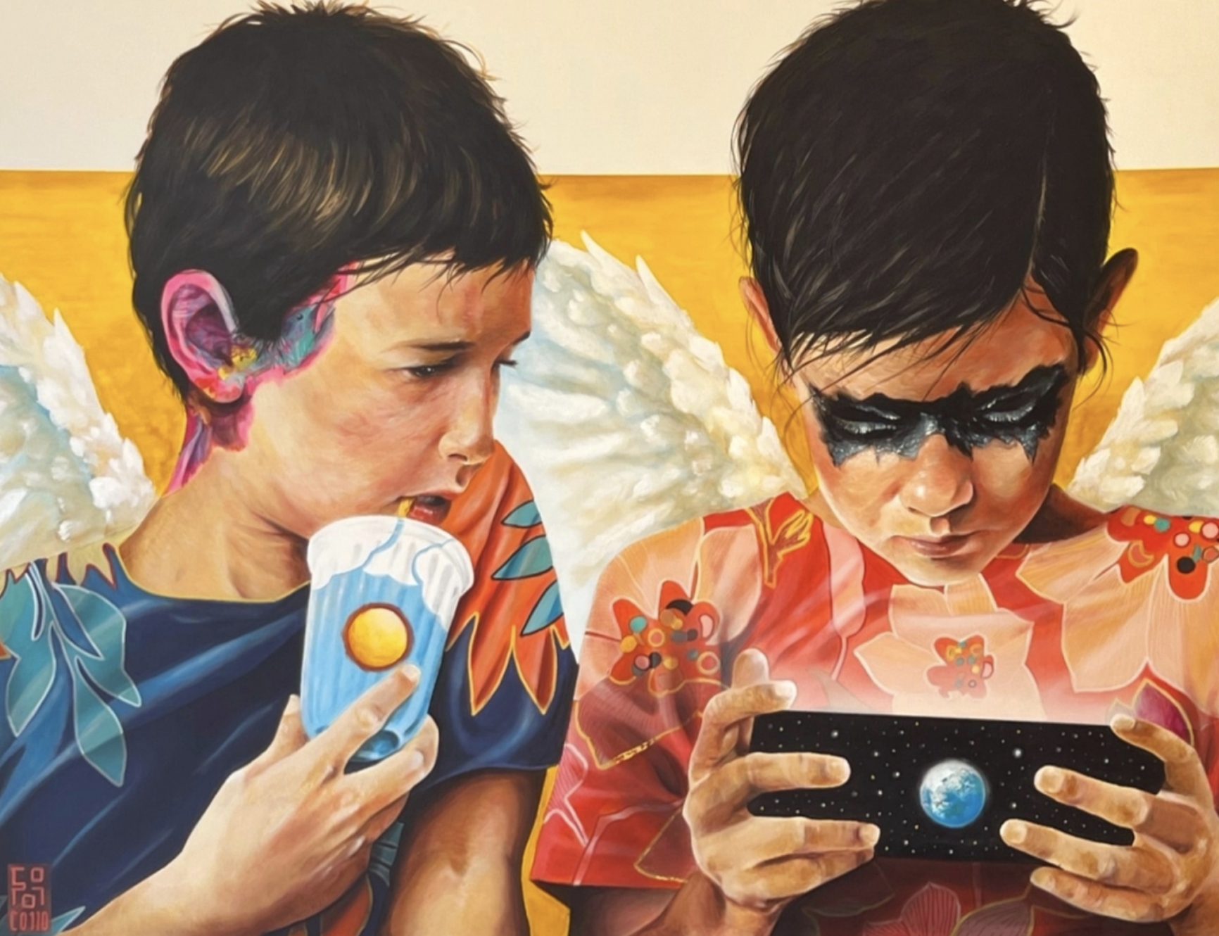 Le tele di Renè (ovviamente è un nome d’arte) soddisfano pienamente il nostro desiderio di serenità e ci conducono verso una confort zone dello spirito che le rende assai gradite al pubblico: l’autore non è certo un outsider, ha alle spalle una lunga carriera, ma negli ultimi anni ha sperimentato con successo una nuova formula compositiva che si basa sulla sovrapposizione di varie immagini iconiche tratte dal mondo dell’arte ma anche dalla cinematografia, dal fumetto e dalla pubblicità.